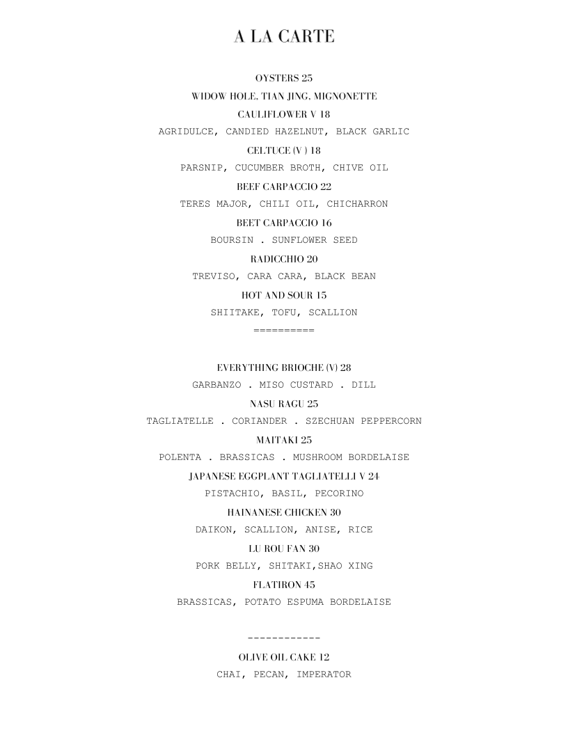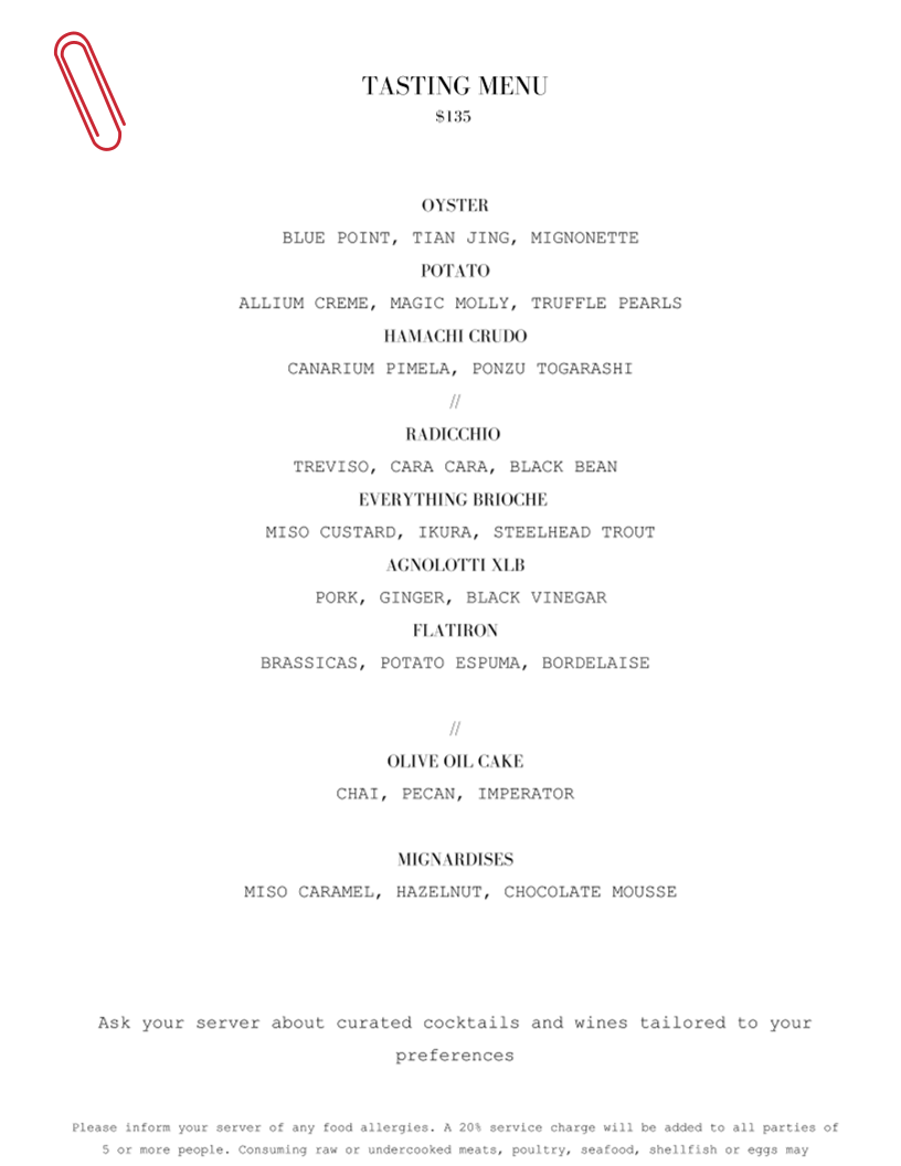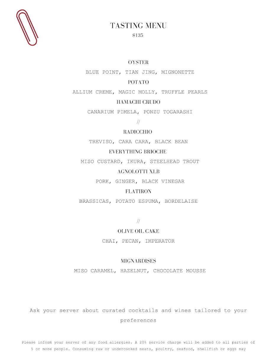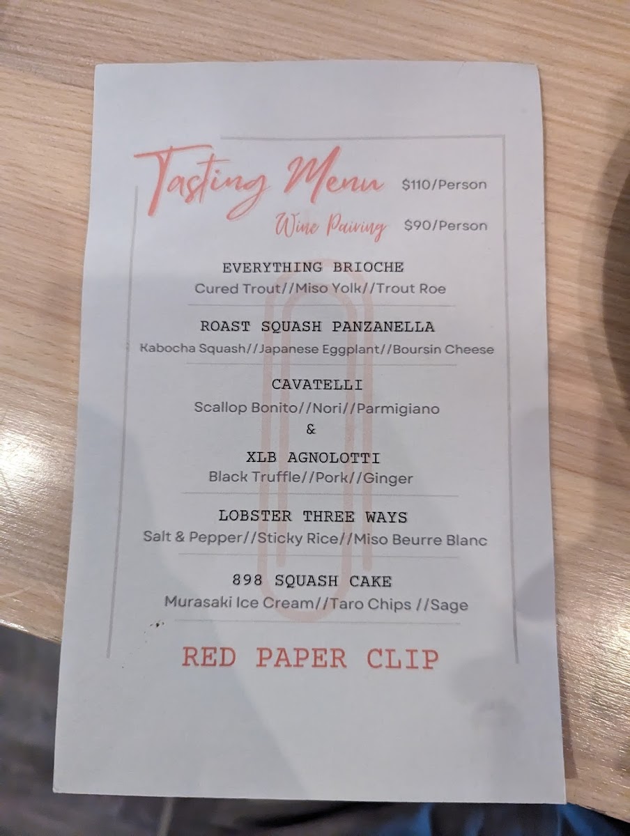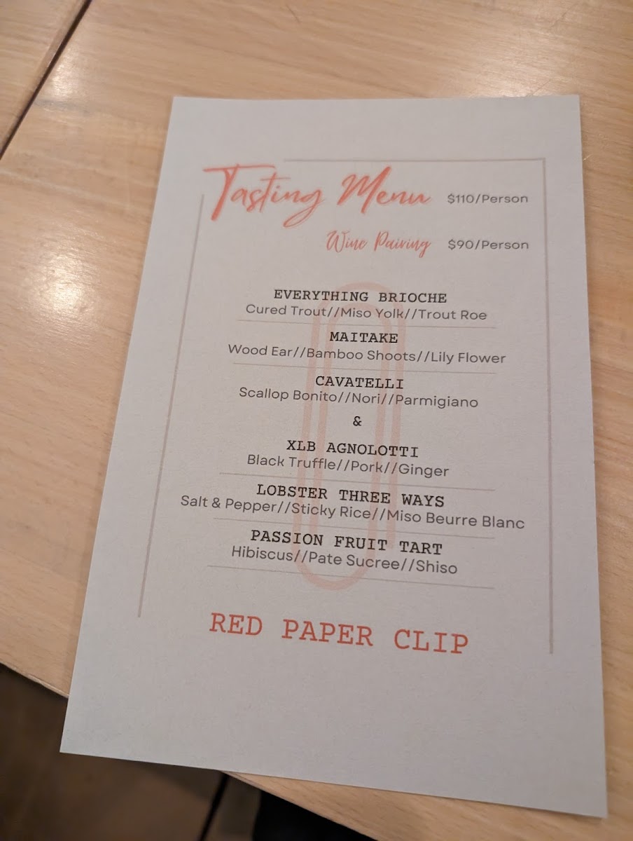 As a reviewer looking back over the menu at Red Paper Clip Restaurant, it’s clear that the experience is carefully curated to balance creativity, restraint, and quality. The à la carte selections set the tone with elegant starters like Oysters, Cauliflower (V), Celtuce (V), Beef Carpaccio, and Beet Carpaccio, each suggesting a focus on freshness, clean flavors, and thoughtful plating. These dishes feel designed to awaken the palate without overwhelming it, offering both plant-forward and protein-driven options that appeal to a wide range of diners. The tasting menu builds on this philosophy with a structured progression of Oyster, Potato, Hamachi Crudo, Radicchio, and Everything Brioche, giving guests a concise yet expressive snapshot of the kitchen’s style and seasonal sensibility.