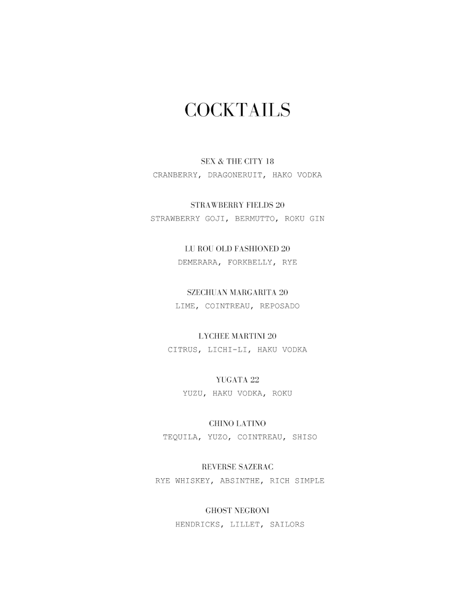Complementing the food is a cocktail list that leans playful yet polished, from the bold Sex & The City to the refreshing Strawberry Fields, the spirit-forward Lu Rou Old Fashioned, the vibrant Szechuan Margarita, and the delicately aromatic Lychee Martini. Wine lovers are equally well served. The white wine selection includes refined bottles such as Terre Darrick Etna Bianco, Domdechant Werner Estate Riesling Trocken, Adolph Müller Piesporter Michelsberg Riesling Spätlese, L’Etincelle Sancerre, and Domaine Salmon Sancerre, offering a spectrum from mineral-driven to gently aromatic. For something more adventurous, the orange wine Podori di Carlo Pinot Grigio adds depth and intrigue. Red wine enthusiasts can explore classic and expressive choices like La Sacrestia Barolo, Barale Barolo, Chianti Classico Riserva, Castello di Paneretta Chianti Classico Riserva, and Montresor Valpolicella Ripasso Capitel della Crosara.